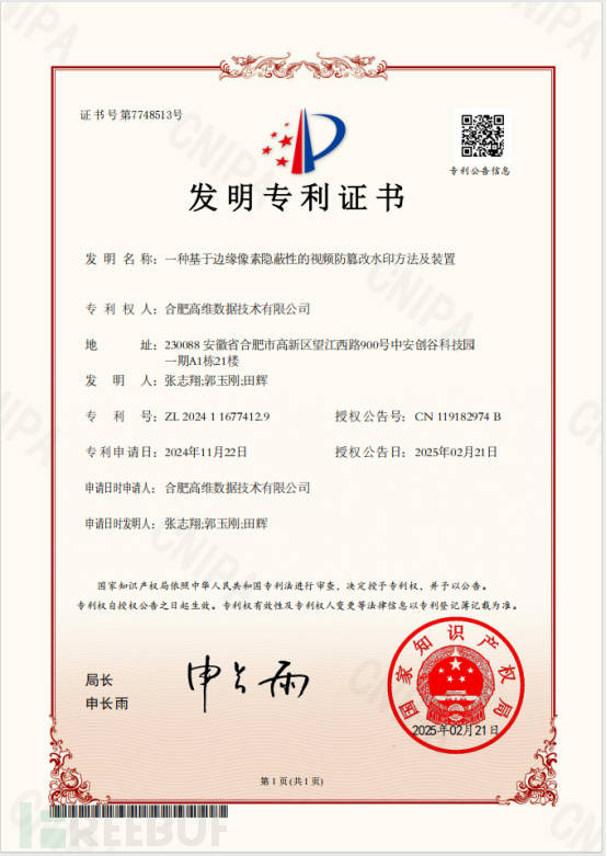 该专利创新性地将水印信息嵌入视频的边缘像素区域,充分利用人眼对边缘细节不敏感的特性和感知哈希算法生成具有缩放不变性 “图像指纹”的优势 ,实现水印的防篡改和深度隐藏。